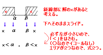 1 斜線部に x と書き込む。 2 図から、そのまま下方へスライドさせて、数とxを書く。 3 当然左に書いた方が小さいので、不等号は <